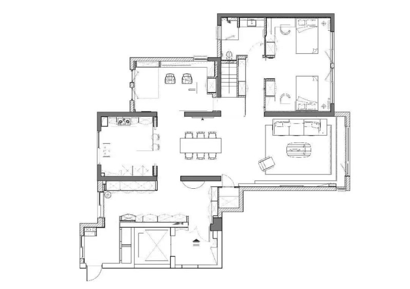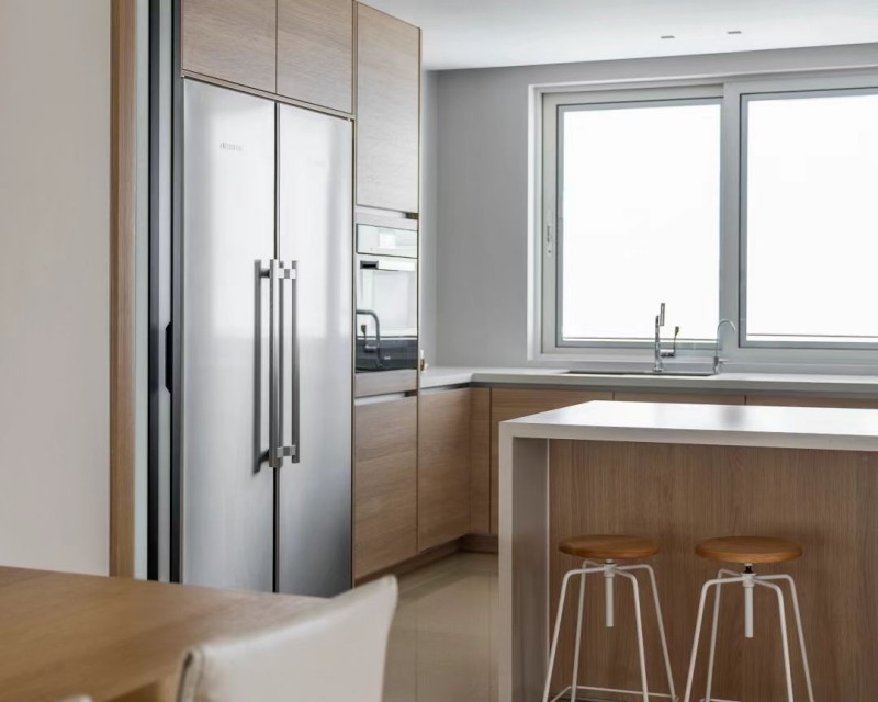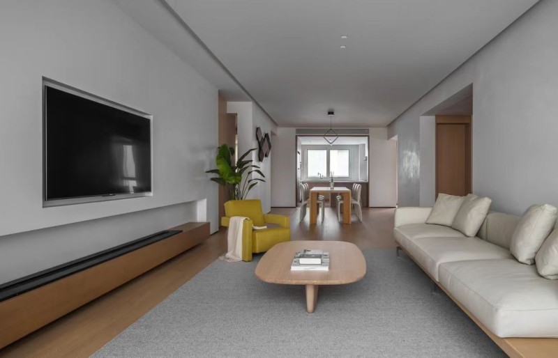 一面是厨房空间的烟火寥寥,代表生活;一面是客厅向光而生的生长力,表达理想。餐厅置于其间,形成天然的中心空间相互串联,不做打断,于是空气是流通的,人在其中的行动也变得顺畅无拘。